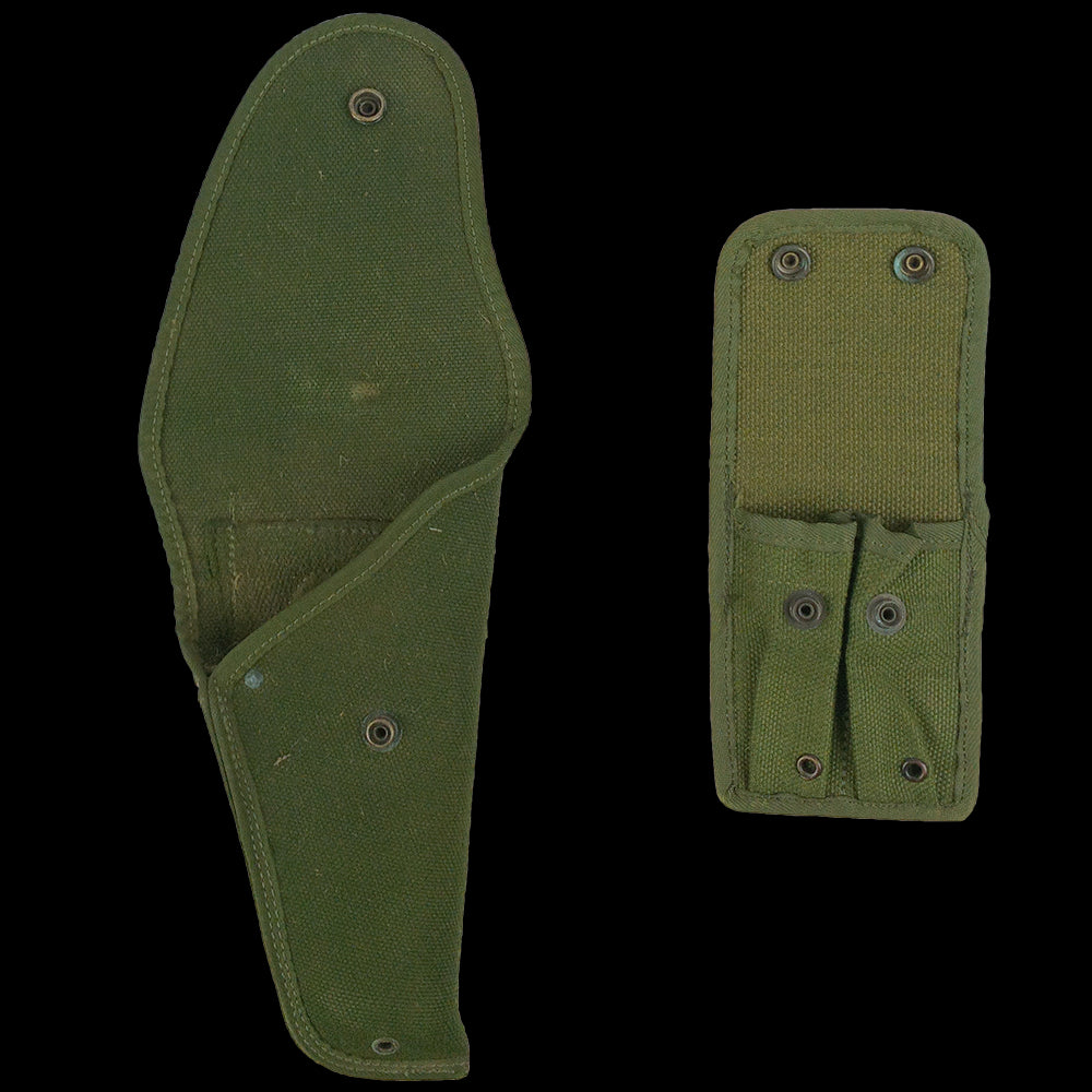 These were used from around 1975 until 2000. In classic olive drab, they are made from sturdy canvas weave and make quite a tidy matching set. The holster is made for the Browning Hi-Power, no surprise as Belgium is the home of infamous Fabrique Nationale (FN). A 2 cell magazine pouch will keep you topped up and the belt is adjustable. Many of these have storage wear, like scuffs, corrosion to the hardware or dust, but otherwise look great for a bit of old kit!