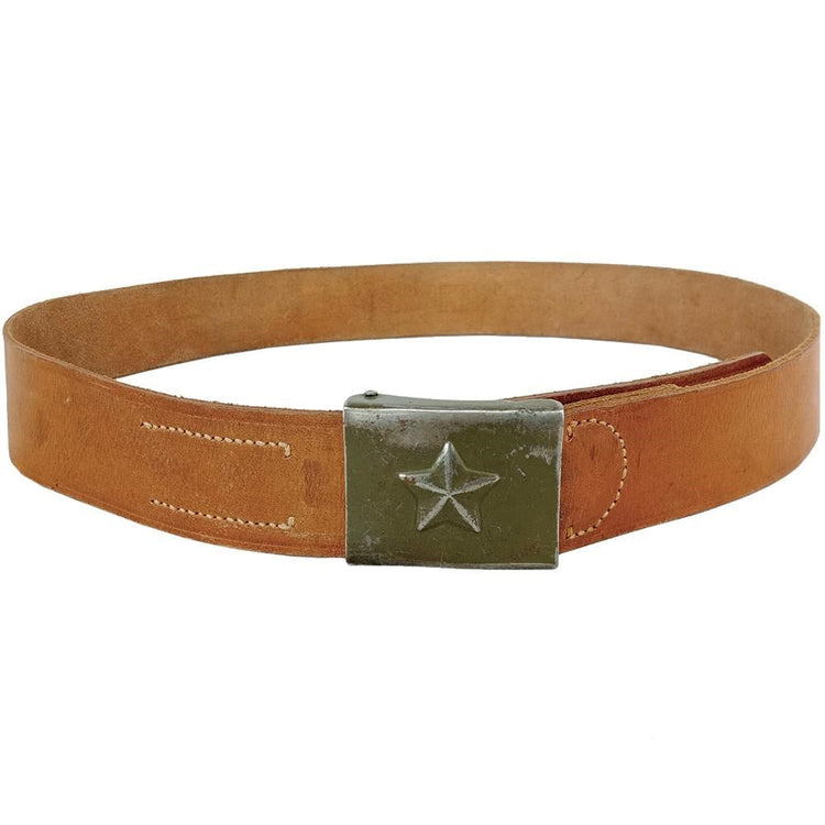 This service belt is surplus of the Army of the Czech Republic. These are mostly dated around the 1980's and is constructed from sturdy leather with a steel buckle. The design is influenced by German service belts from the WW2 era. An embossed star emblem is a prominent feature on the buckle. There are some scuffs and scratches on the buckle, although it adds to the genuine and vintage feel of the belt. It's a nice piece for a collection and a bold look around the waist.
