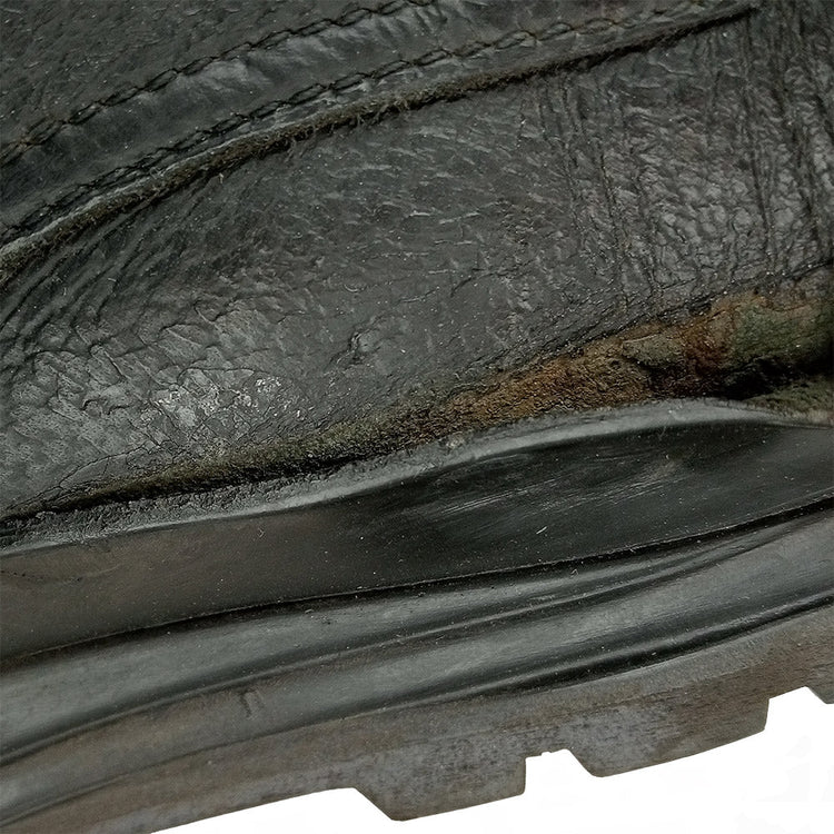 Poor Swiss boot. We have a few Value Grade pairs where the main (and most often only) problem is delamination from the sole to leather, around the zone where your toes bend. In the 4th picture the problem is exaggerated by prying the layers open, to show the kind of damage better. Rarer, some boots have a little degradation to the outer soles (like the last picture). Perhaps a cobbler can help these out, or at least anyone handy with a bit of shoe-goo can prolong the life of these fantastic boots.