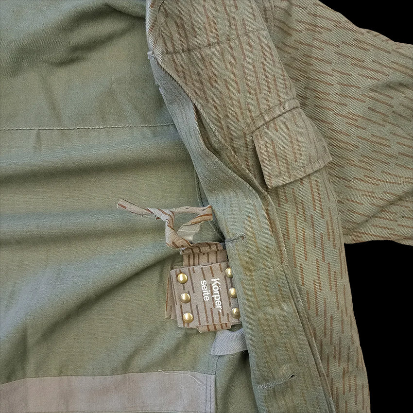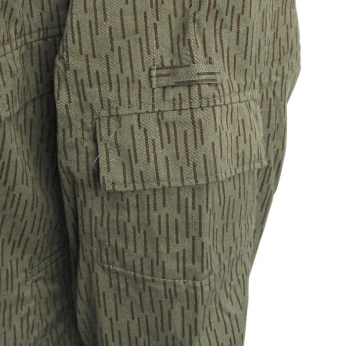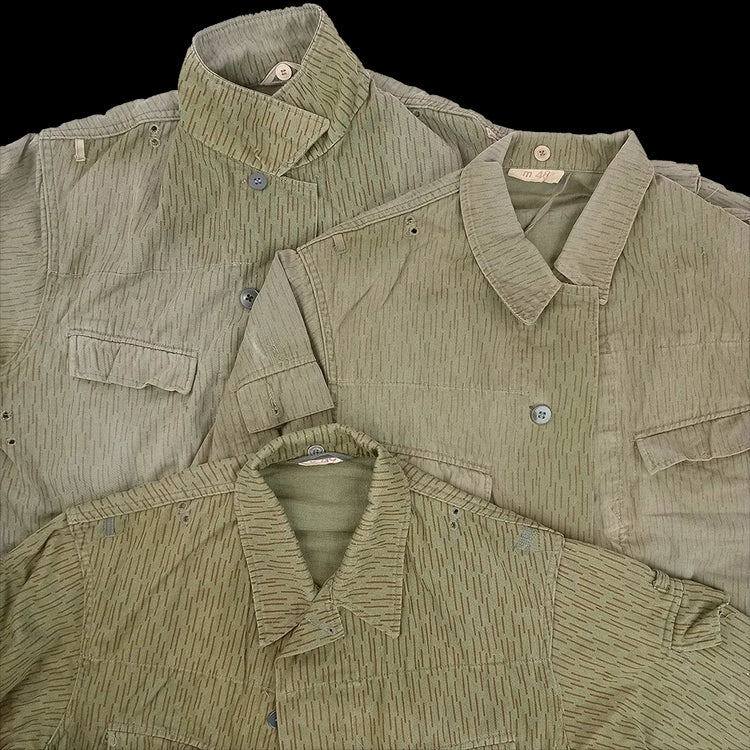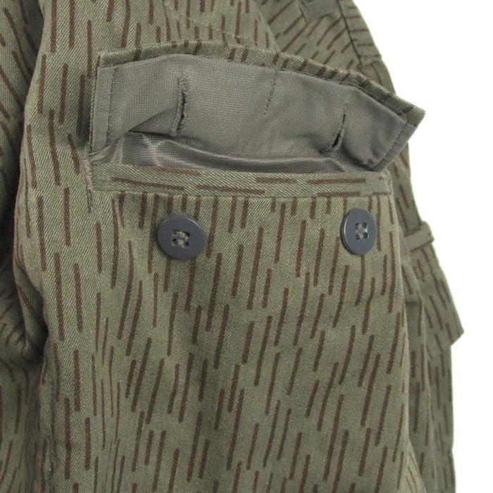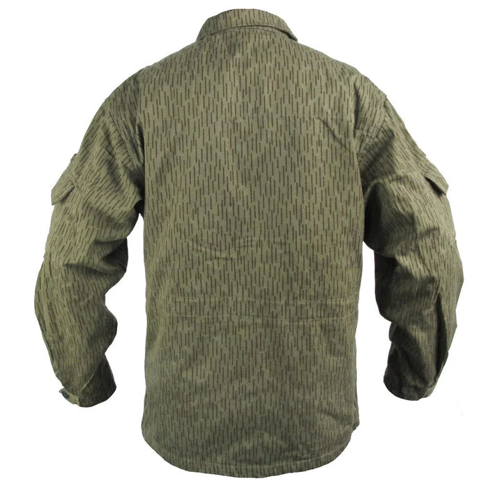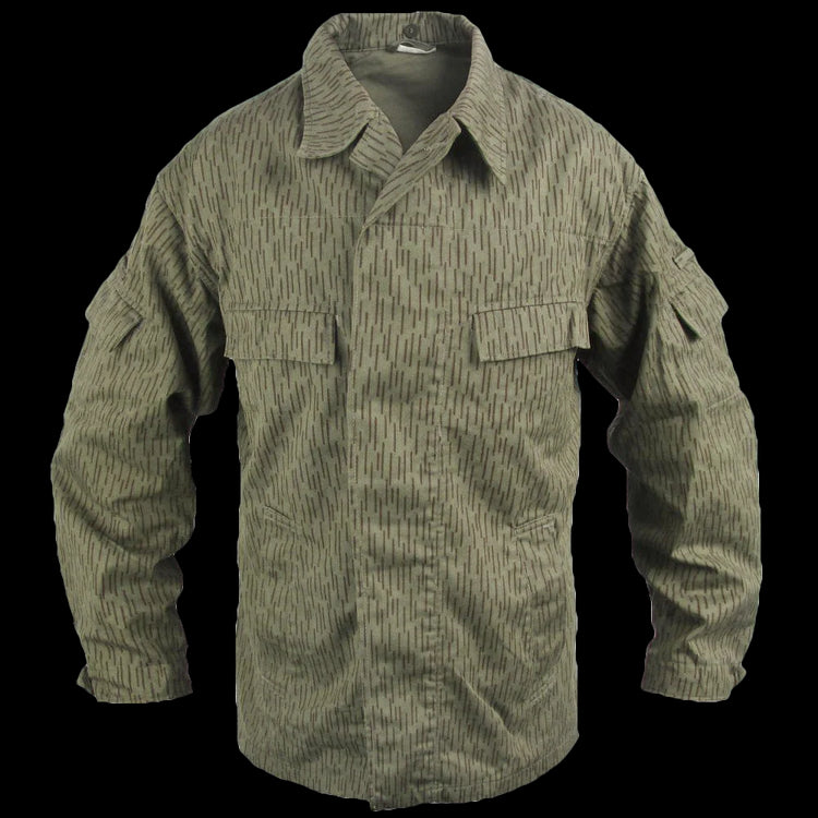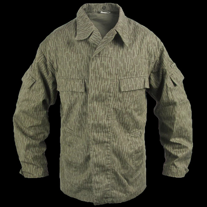 This combat shirt was issued to The National People's Army of East Germany for over 30 years. Starting in 1968, they were manufactured and issued up until 1990. The Rain Camo pattern (Strichmuster) was influenced by WW2 German designs such as Splittermuster and Sumpftarn. "Rain" refers to the camouflage pattern, this is not a waterproof shirt.