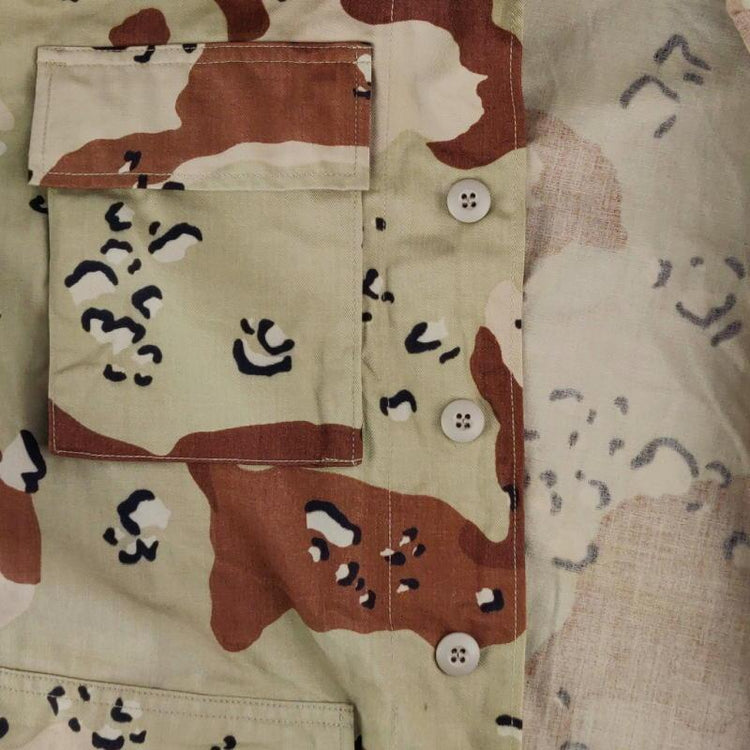A genuine US Army issue Desert BDU shirt. This shirt and camo pattern has been replicated many times but here you're getting the real deal! The camouflage is known as the six-colour desert pattern, though tastefully nicknamed "Chocolate-chip" or "Cookie Dough" camouflage. Made for use in arid environments and was most notably used during the Persian Gulf War.