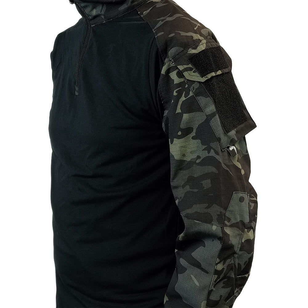 As you come to expect, these follow a pretty standard pattern - stretchy, thin fabric on the torso to allow your body to breathe and rip-stop arms and neck for high friction areas. A quarter length zip allows for easy donning as well as another way to vent some heat and perspiration out. The arms both have a concealed small pocket with hook & loop areas on the outside for adding ID/morale patches.