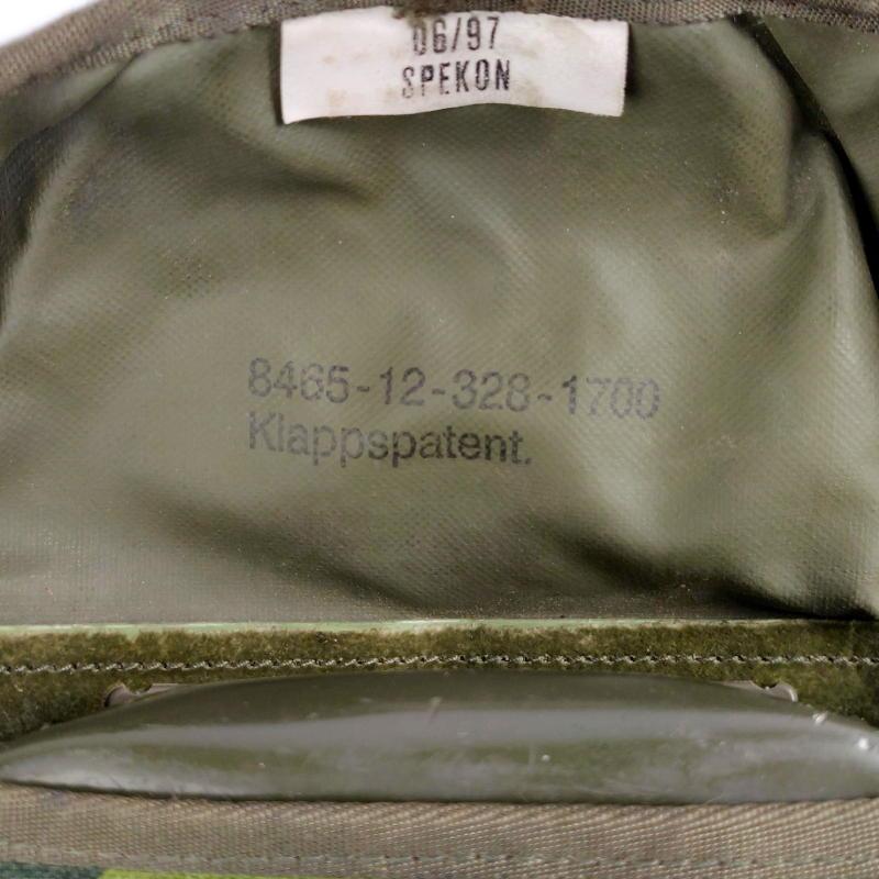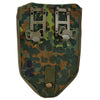 These collapsible shovels are stamped with "BUND", meaning Bundeswehr - the German Armed Forces. Built to NATO specifications, this steel shovel is able to be configured in to three different forms. Fully extended, this shovel is ideal for standard digging use. The shovel head can be locked in a 90 degree position, making a mattock-like shape. This is good for vertical digging. The final configuration fully collapses the shovel for it to fit in the flecktarn carry case.