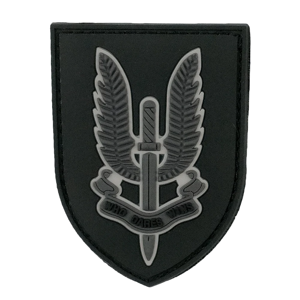 A medium sized PVC shield patch featuring the winged dagger and motto of the Special Air Service, ''Who Dares Wins'', with minimised visibility signature. Show your respect for a legendary force.