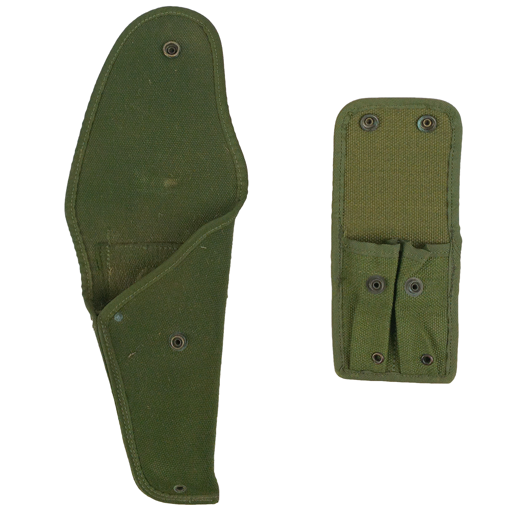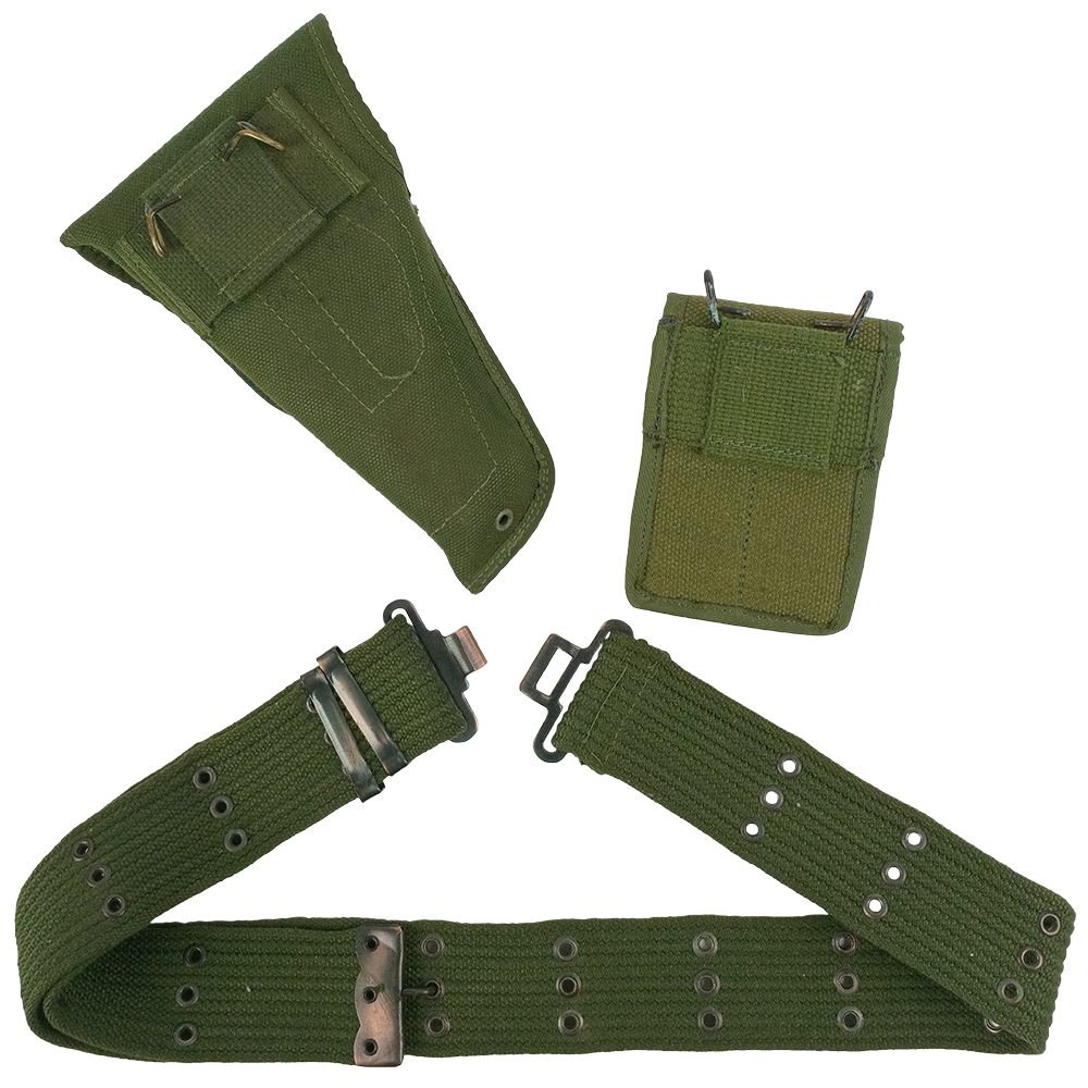 These were used from around 1975 until 2000. In classic olive drab, they are made from sturdy canvas weave and make quite a tidy matching set. The holster is made for the Browning Hi-Power, no surprise as Belgium is the home of infamous Fabrique Nationale (FN). A 2 cell magazine pouch will keep you topped up and the belt is adjustable. Many of these have storage wear, like scuffs, corrosion to the hardware or dust, but otherwise look great for a bit of old kit!
