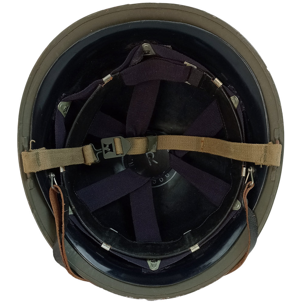 Constructed from solid steel with a canvas chin strap and steel hook. Like the M1, the M51 has a rolled edge, though the visor doesn't extend as far. This French helmet is a must have for a military collection.