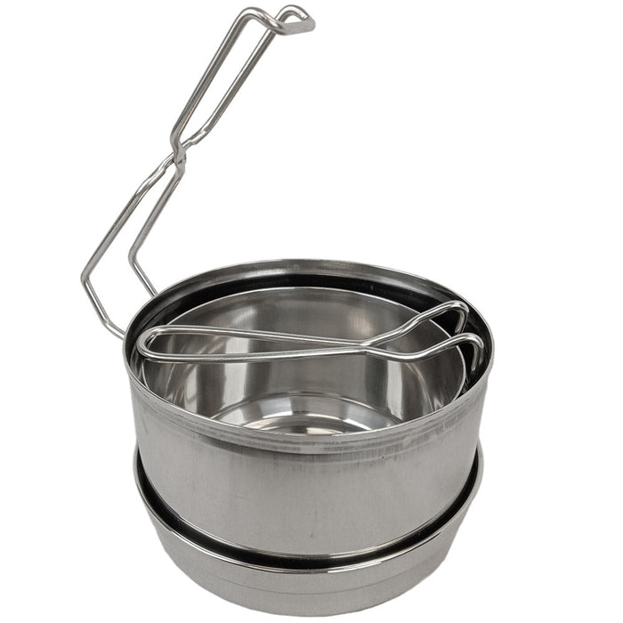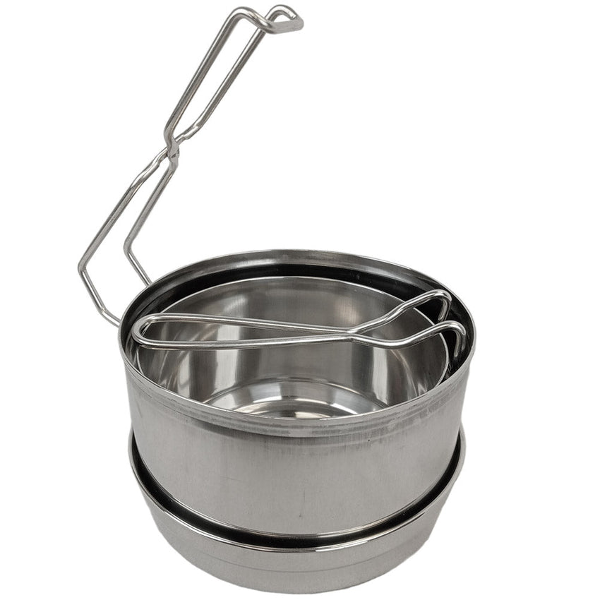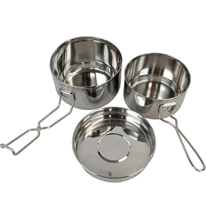 The mess kit includes a 1.5L pot, and a smaller 1L pot. An stainless steel construction allows for use on a open flame. Put a military spin on your next hike and slide this cookware into your pack. Also great for camping.