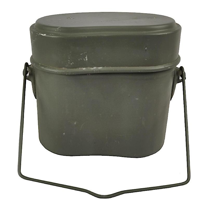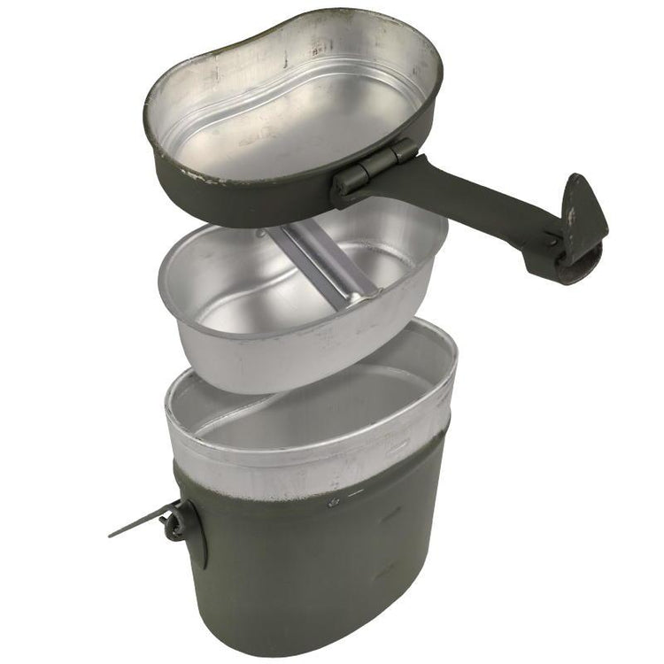 An original mess kit of the NVA (Nationale Volksarmee). Essentially a clone of the tins the Germans used during WWII, the Kochgeschirr 31. The NVA creatively made it their own by covering it in grey paint. A simple 3-piece field cooking kit that you can hang off a belt or pack for your next outdoor trip.