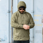 This fellow is a fleece lined, anorak style mid layer. These are close fitting but could be worn with a thin base layer (such as a thermal top) underneath. These are so close fitting - especially around the chest/armpits - we recommend to size up for comfort (or aesthetic). These ''smocks'' have wind sealed zips all over (quite a few!) and aid in temperature regulation and function. The two slanted pockets are access points for one kangaroo style pocket (great for warming hands) and the mid-chest pocket adds more storage. Zips to the underarms and torso sides let in some fresh air if you are a bit too toasty. The whole interior is lined with fleece and the exterior is a thin ripstop nylon. A small emergency hood is stowable in the neck. Hook & loop adjustable waist and cuffs + a draw cord to the neck seal you up for extra toastiness.