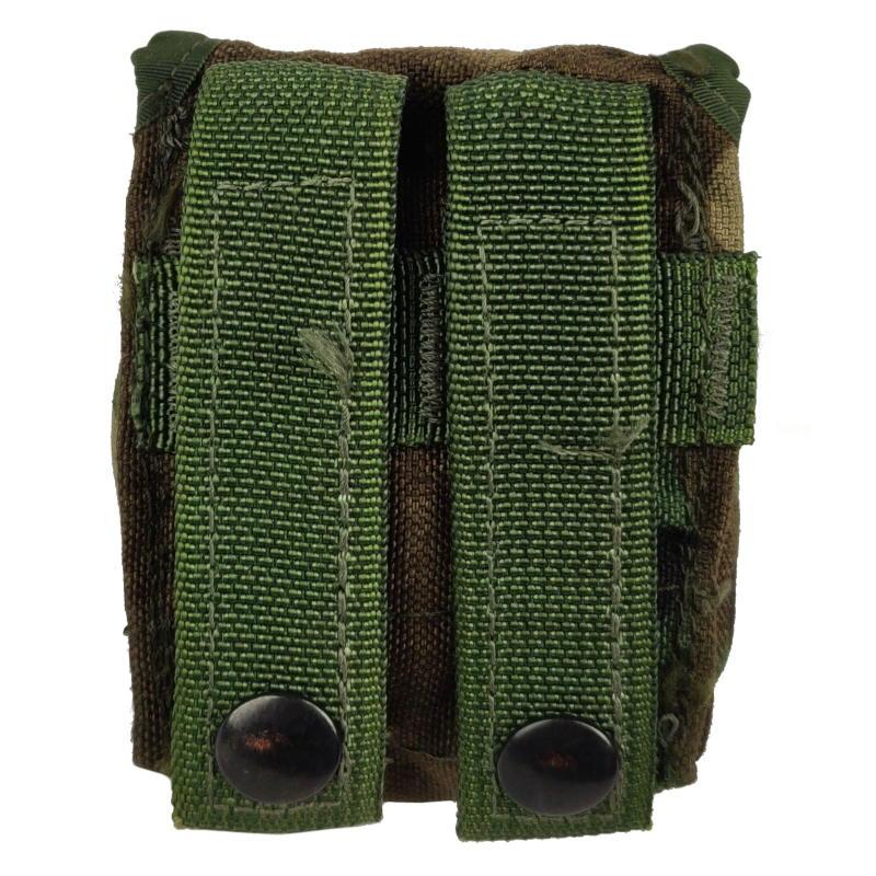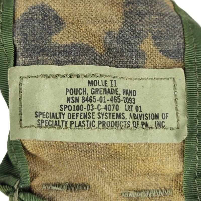 These woodland camouflage grenade pouches are genuine surplus from the US Army. Manufactured by Specialty Defense using tough Cordura nylon. Designed to hold a fragmentation grenade on a MOLLE combat vest and other MOLLE compatible gear.