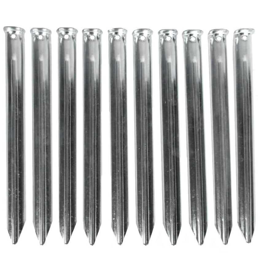 This tent peg set comes with 10 steel pegs, measuring 23cm each in length. The flat head makes it easy to hammer and remove from the ground. Guy lines can be easily looped over the hook at the top to secure down a tent.