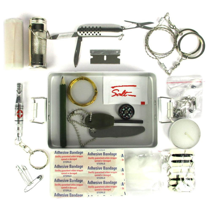 When you find yourself in a tough situation, or the beginning of the apocalypse, a packed survival kit is an essential item. The aluminium box is lightweight yet durable, with the contents securely locked in by the watertight lid. Be sure to keep this kit close by, at home, in your glove box, or take it camping!