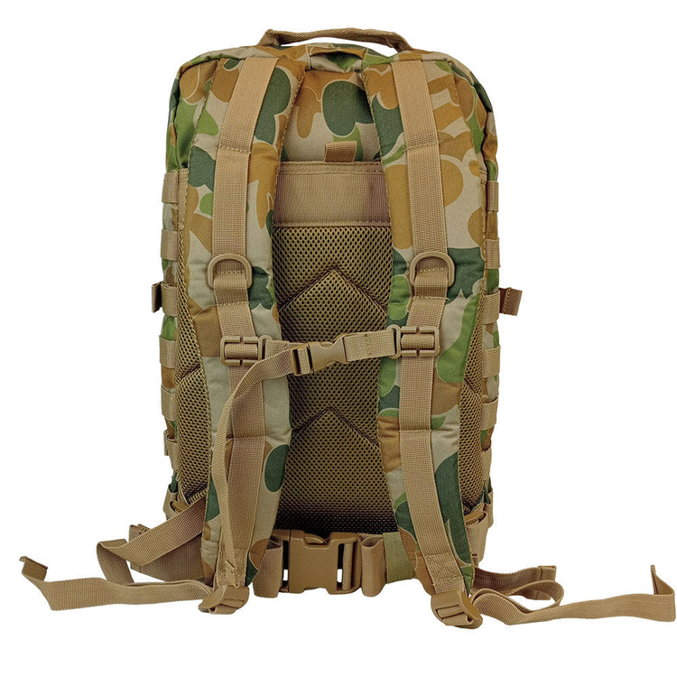 Same features as the smaller 20L version, just bigger! These fantastic packs are always a crowd pleaser, featuring military style and functionality without the wear and tear of surplus equipment. Perfect for day to day activities like sports, study, cycling and people looking for a good alternative to messenger bags... Or those fanatical about Australia's hearts & bunnies camo, DPCU.