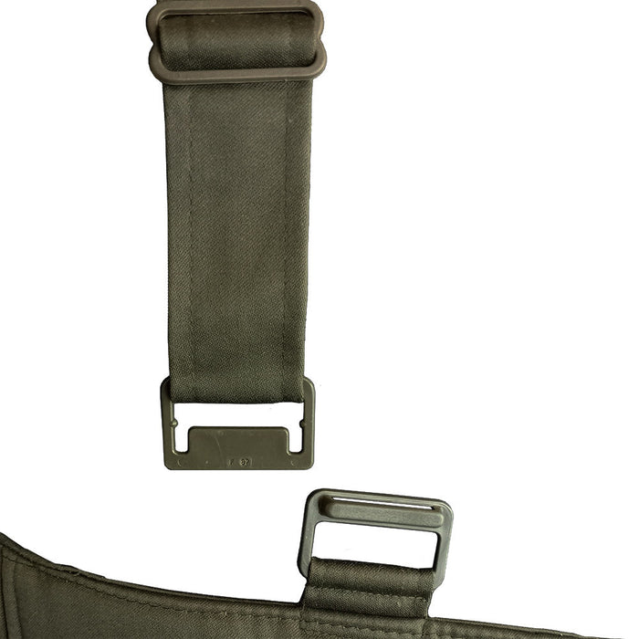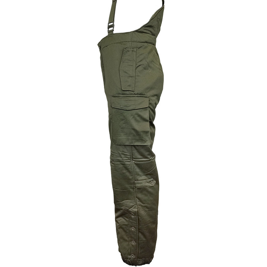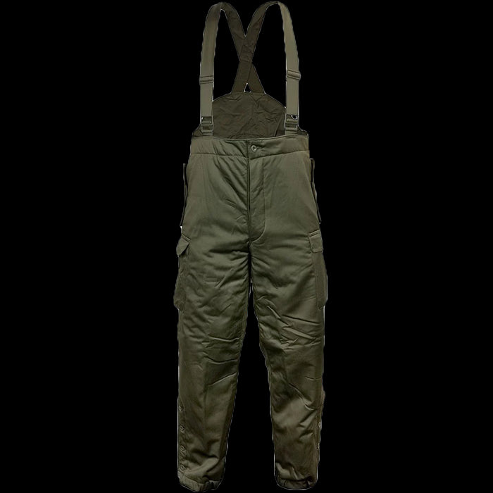 In the classic colourway RAL7013, these Austrian winter pants are generously sized to be worn over layers and the back has a high rise so no cold drafts get in there. Held up with adjustable braces, these are lined with polyamide, have a semi-shiny polycotton outer and are basically unissued- the only thing holding them back is perhaps some storage crud or dust. Designed to be short in the leg to fit into winter boots, perhaps select a size taller if you are not a winter boot person but keep in mind these are already oversized in the waist to accommodate underlayers.