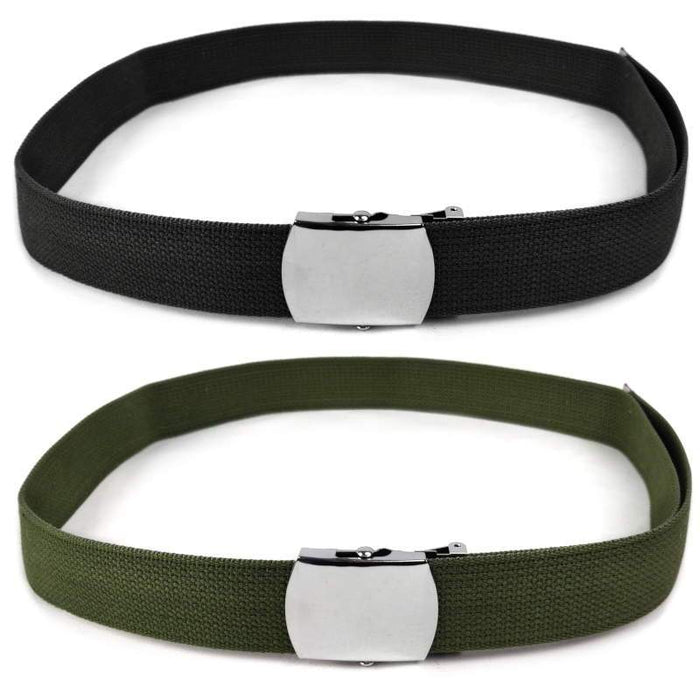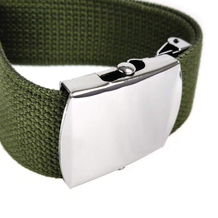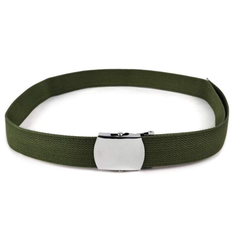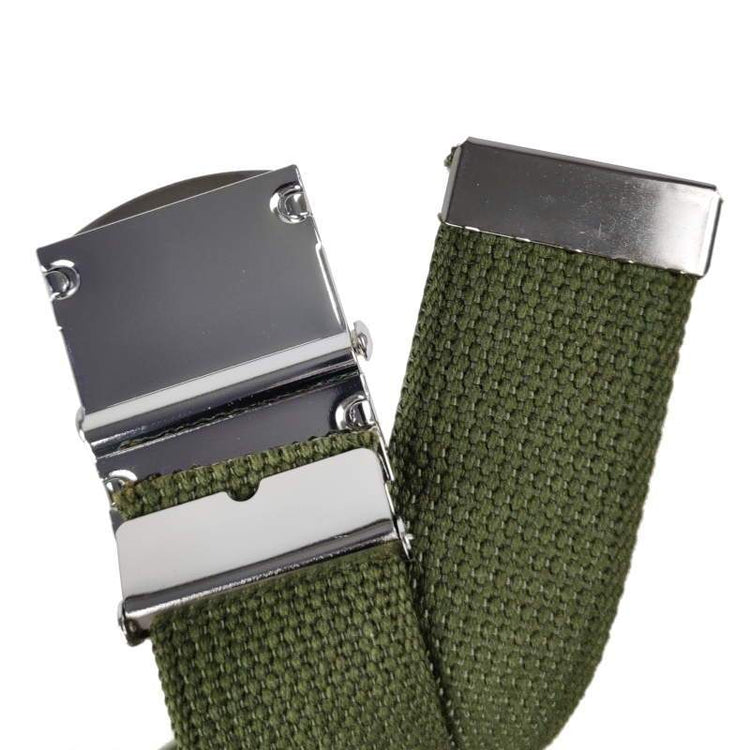 A bog standard military-type belt. This style of belt was most notably used by the US Army. It features a metal autogrip buckle which prevents slippage of the cotton canvas web belt. A metal fixing on the opposite end from the buckle prevents the material from fraying. Keep your trousers up in classic military style with this web belt.