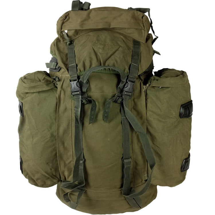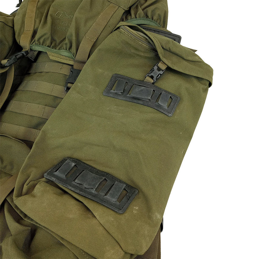 Two zip on 10L Multi Mission Side Pockets (MMPS) can modify the carrying capacity from 80L to 100L. When removed, these MMPS can be zipped together but they do not come with the shoulder straps to make a separate mini day bag. Some packs have PALS webbing for MOLLE attachment, under the outer haul handle, where more pouches may be added - but on some packs this webbing is not present, like the first picture. These packs have incomplete frames - they will need replacing or modification (missing cross braces). Graded as Very Good, get one of these iconic packs while you can and hit those trails!
