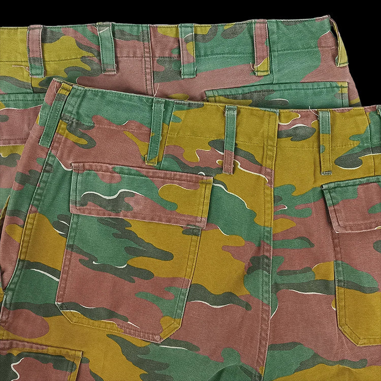 The good old 'jigsaw' pattern dates all the way back the 1960s - these pants are what the Belgian Army issued with an updated pattern from the 1990's onwards. This version has a much more heavier weight to them allowing them to be used in colder months. In our latest batch are slight variations in colour, with mustard yellow to yellow-green in the lighter splotch. These have been pretty well utilised and some may have worn areas or very small holes.