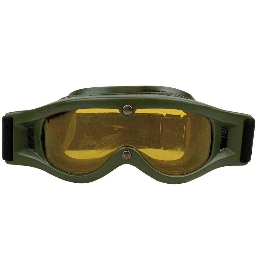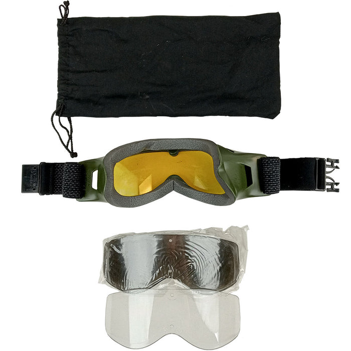 These Defender goggles by Bolle have an olive drab frame and 3 lens options: tinted, clear and yellow. This model have been used by various militaries for sun, wind and dust protection. As these goggles are used surplus, the lenses fitted are not all the same colour and may be scratched - some spare lenses are in plastic sleeves but we can't know what has happened to them during their lifetime. Past users have removed foam to the outer rim ventilation, which further aids ventilation but reduces the catchment of fine particles. These goggles have a wide frame and lip to the outer sides, handy for grabbing with gloved hands. The outer frame is flexible (but might be indented and need reshaping on some pairs) and has foam padding to the face for comfort. The adjustable, elastic strap with silicon stay up backing should fit most heads and helmets.