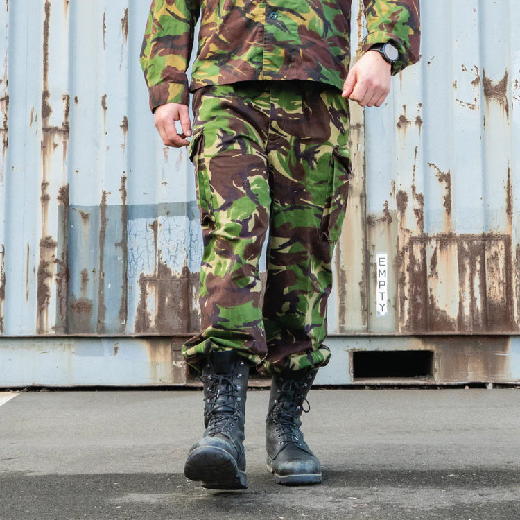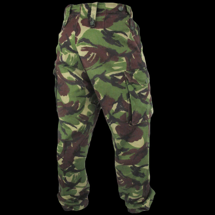 British Army 1980's issue DPM combat trousers. In this batch are a mix of styles, from temperate to tropical, and this means there will be some colour and material variations. With good capacity for carrying gear in the field, cargo and hip pockets can be stocked up with your favourite cuppa tea and monarch memorabilia. Plenty of waist adjustment going on for times when the full English breakfast goes too hard, these have waist adjustment tabs and a front draw cord.