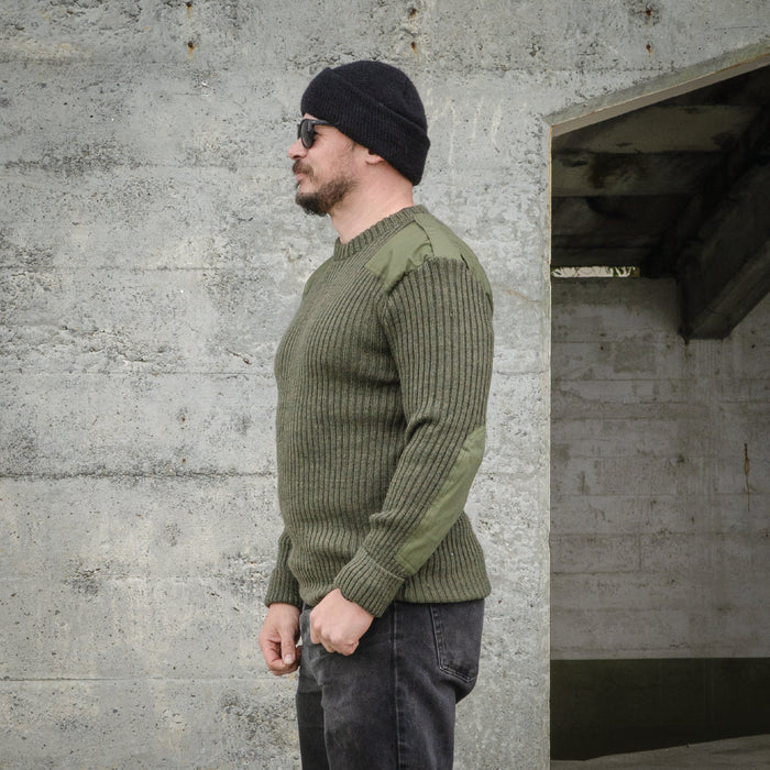 Worn by many military personnel from WWII up until the present day. Truly a timeless and popular design. They are a comfortable rib knit sweater with a snug, yet stretchy fit for good freedom of movement. Made from moisture wicking and warm wool. Durable poly/cotton reinforcements protect the elbows, forearms and shoulder areas that will add years of good hard use to the jumper.