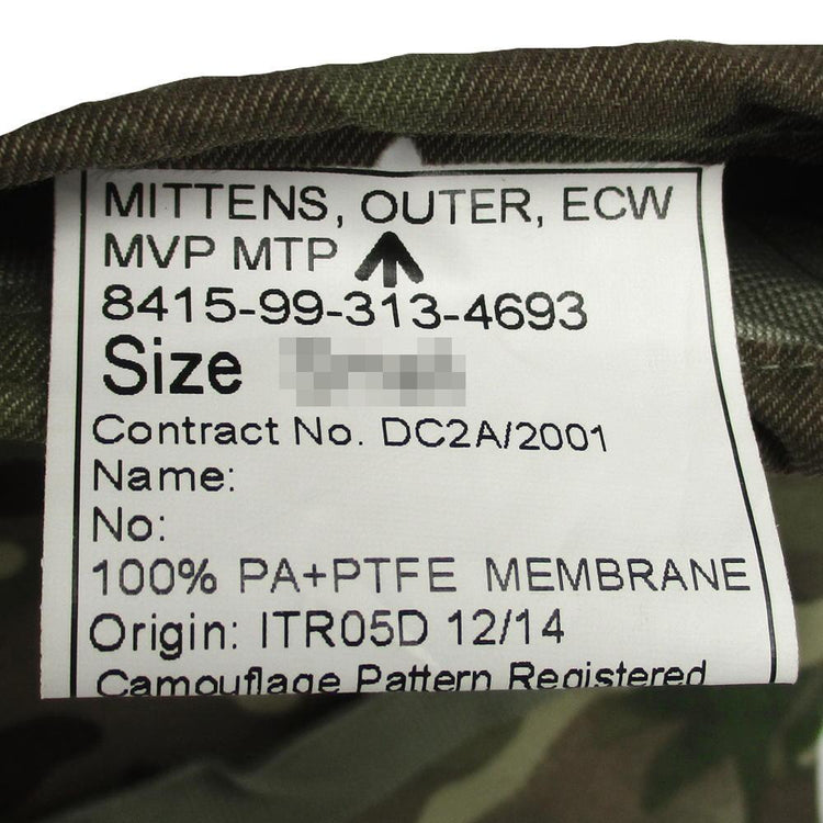 These Extreme Cold Weather (ECW) mittens are genuine surplus of the British Army. They are used as a waterproof outer layer over gloves. MTP (Multi Terrain Pattern) is a highly effective camouflage across a wide range of environments and will match a large collection of other British MTP gear.