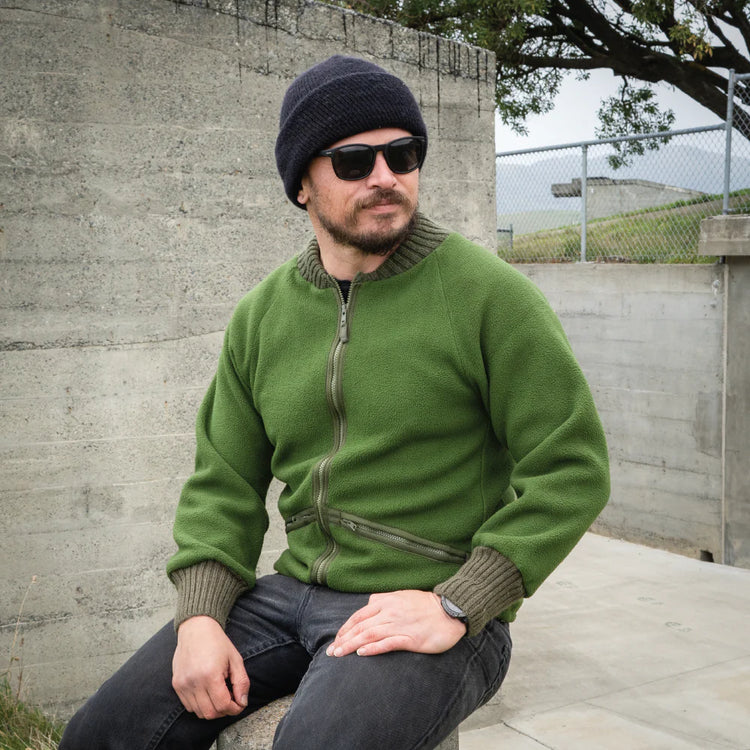 These fleeces are very straight forward - the front has a full length zip with a small pull tab. These can be zipped up to the top your chest. Both the collar and cuffs are made with stretchy wool and have thumb-holes so you can pull the sleeves down over your knuckles.