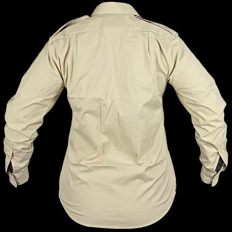 Women's cut long sleeve shirt in a nice easy ''fawn'' or creamy eggshell beige. These may have insignia to the sleeves but if they do and you just want a plain shirt, patches could easily be unpicked.