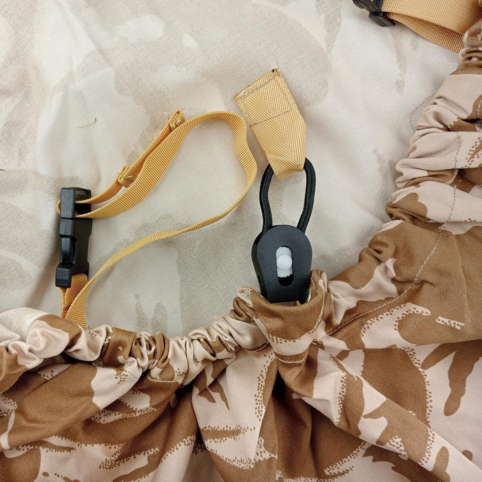These packs are what the British Army issued to cover their large bergens in desert environments. Most of these come from the mid to late 2000's and haven't seen any use since the Army transitioned to MTP fairly quickly. Intended to both better conceal soldiers packs as well as keep dust or other debris from entering their pack, these covers are made from pretty thick majority cotton material. A thick internal bungee cord runs around the rim and can be adjusted with a stopper. Internally it also has four straps with clips for better fixture incase the wind really picks up.
