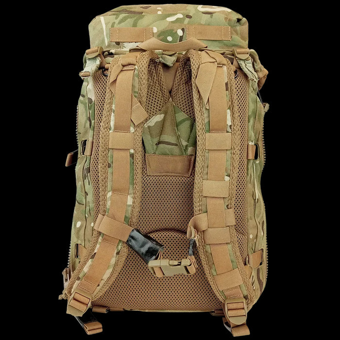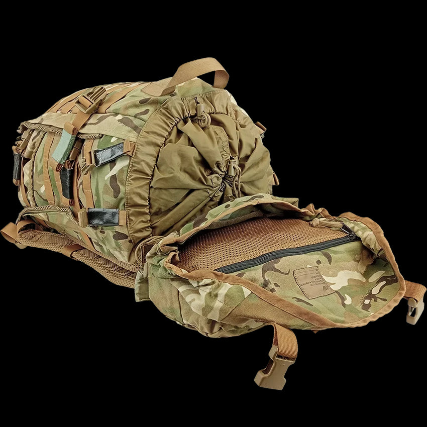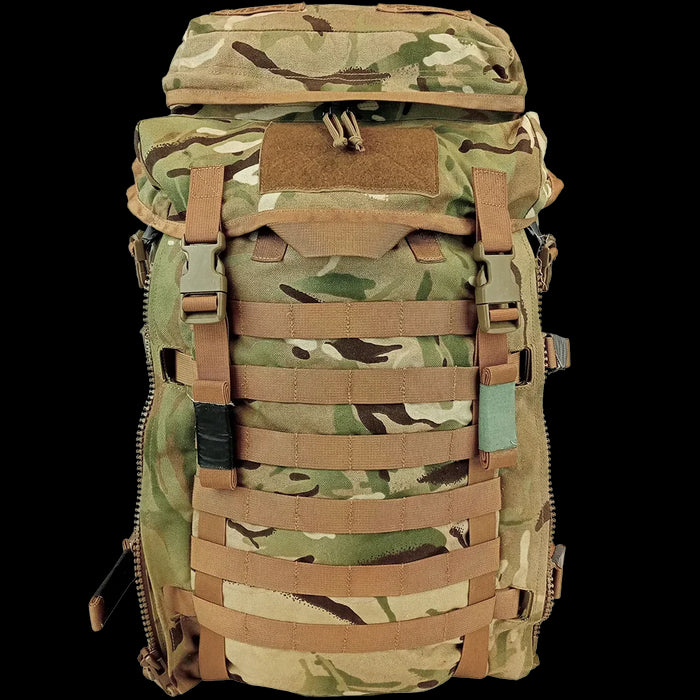 MOLLE to the front and sides allows you to customise your loadout with extra gear or pouches. And if you're one of those lucky ducks with the MTP side pouches, chuck those on for even more storage and compartmentilisation. The nylon construction and sturdy build means you can biff these through all the brambles you want. Handy lid and open side pockets, stowage collars and compression straps are a nice touch on such a heavy duty piece of gear. A wicked, medium sized bit of kit. Grab one if you are lugging about a decent (but not a huge) amount of gear.