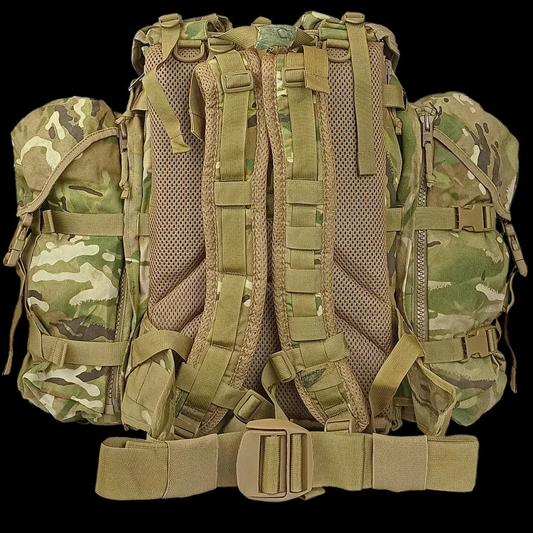 The British Army ECM (Electronic CounterMeasures) Lightweight Bergen made by Karrimor SF is a ~45‑litre nylon Cordura patrol pack made with some unique features for British soldiers lugging around electronic gear.