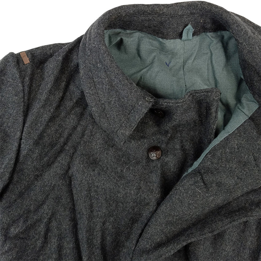 Issued during the Cold War era in Bulgaria as a full length overcoat that extends down past the knees and keeps you warm with a high wool content in the fabric. The front flap secures with six buttons, starting just below the collar and finishing at the waist. Additional details like the red trim on the epaulettes and collar make this piece stand out against other military coats. The cuffs are rolled back and stitched in place. Give yourself to the darkside and let the coat wrap you in its embrace.