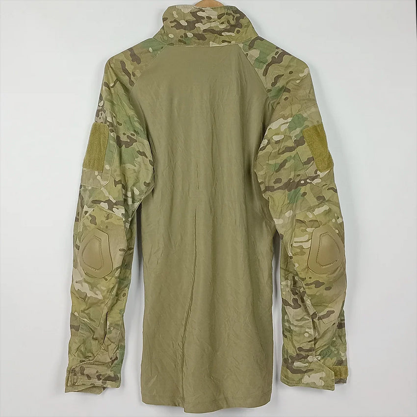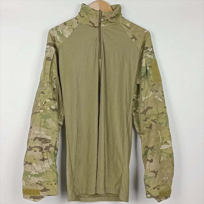 Generation 1 Crye Precision combat shirt. Differing from future generations, these have vertical arm pocket openings, silky soft wicking torso fabric and tag nested in the sleeve cuff adjustments (excellent design for rolling sleeves too). Includes elbow pads. Quite uncommon and very nice condition.