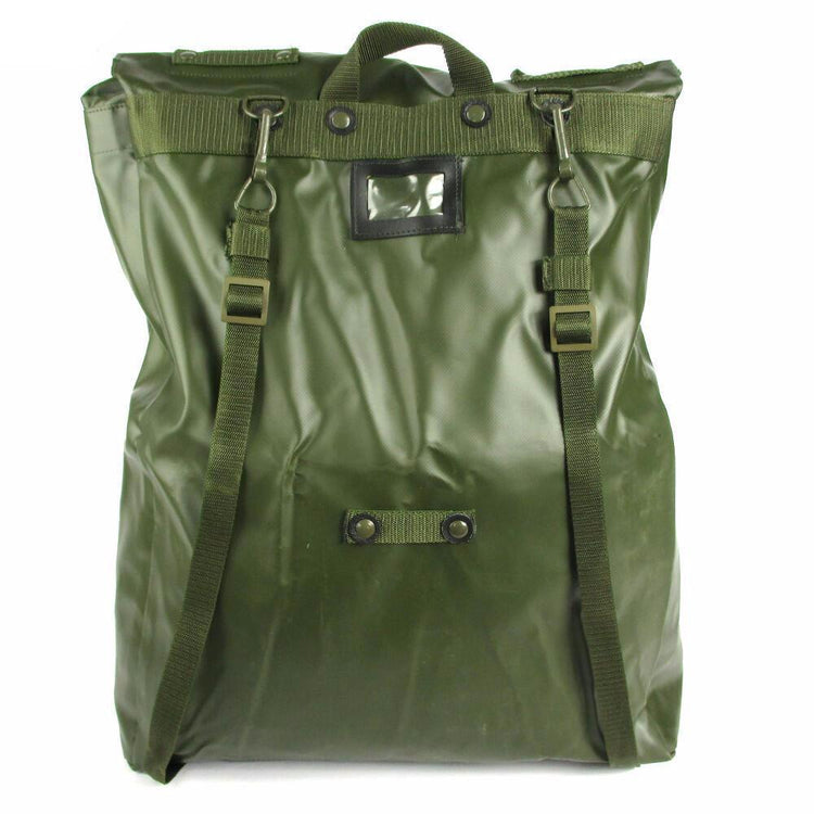 Here is a great water resistant offering from the Czech Army. This is a good general purpose bag that will keep out the rain. A large main compartment and 2 smaller ones will fit all of your gear. Two narrow shoulder straps are attached to the pack with spring hook attachments. These may have some marks or corrosion from storage but appear in good shape. Keep your kit dry and slap it in one of these.