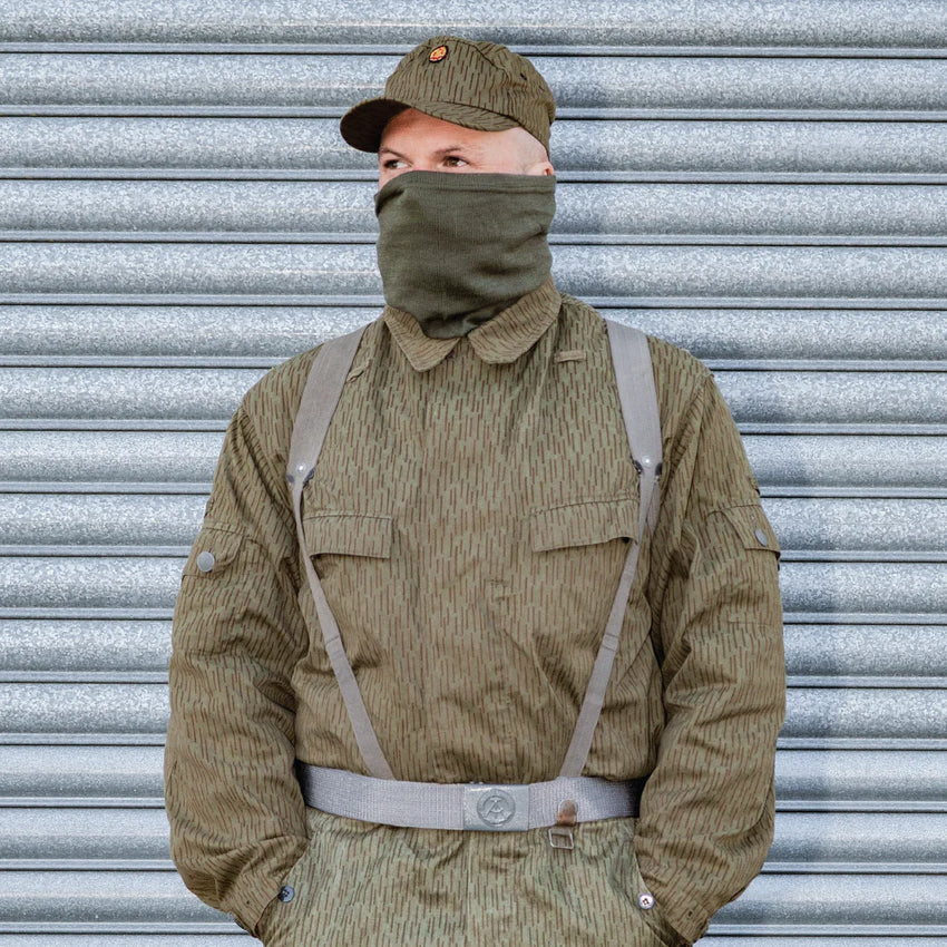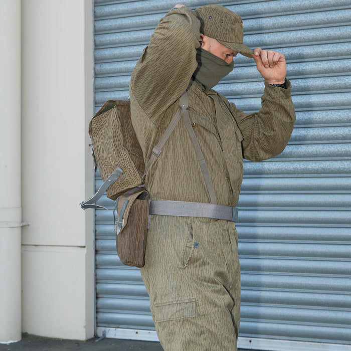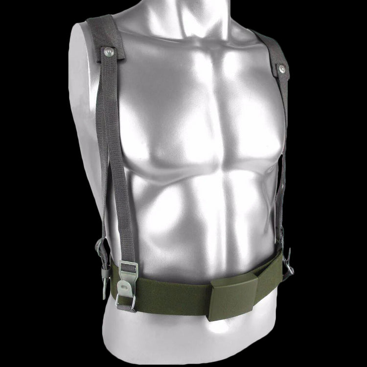 These East German suspenders are designed to attach to a webbing belt (not included) and help keep your pouches and weight distribution in order. They use an adjustable hook system that stays secured to your gear and can be quickly released. Due to their length, your belt and trousers will ride higher (as displayed by our silver friend), this keeps your trousers off of the muddy ground.