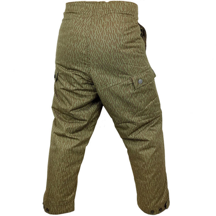Get snuggly in strichtarn! These trousers are what East German soldiers were issued for winter. With a smooth polyester lining and padded polyamide layer inside, these will keep you warm. The outside is made from a rugged cotton exterior and complete in the iconic strichtarn/strichmuster camouflage. No belt loops here - these are designed to be held up by Y-strap suspenders to help keep the weight off your hips.