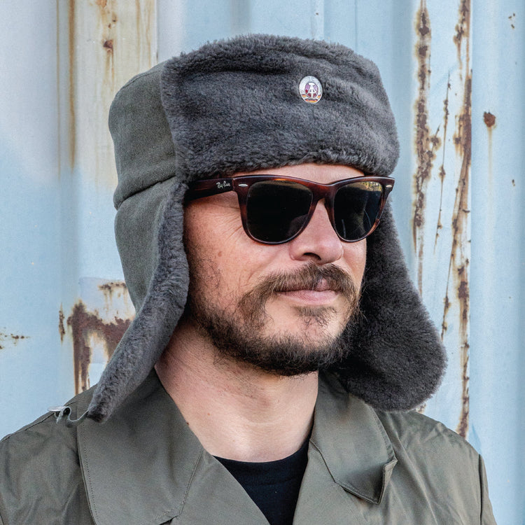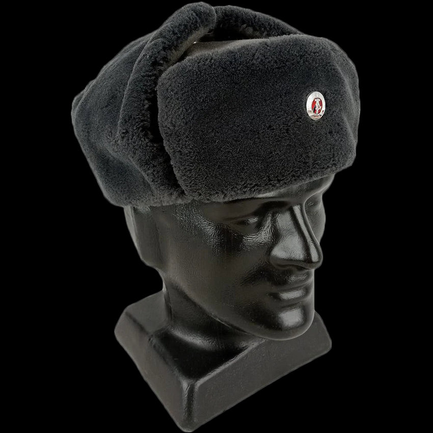 Genuine East German (German Democratic Republic) Army issue ushanka. The war was cold and so was the winter air. Troops would wear these warm ushankas to protect their head, ears, and chin from the cold. The faux fur (or fish fur) ear flaps can be buttoned under the chin or tied back, ski-style. These remained as part of the winter German Police uniform after the reunification of Germany.