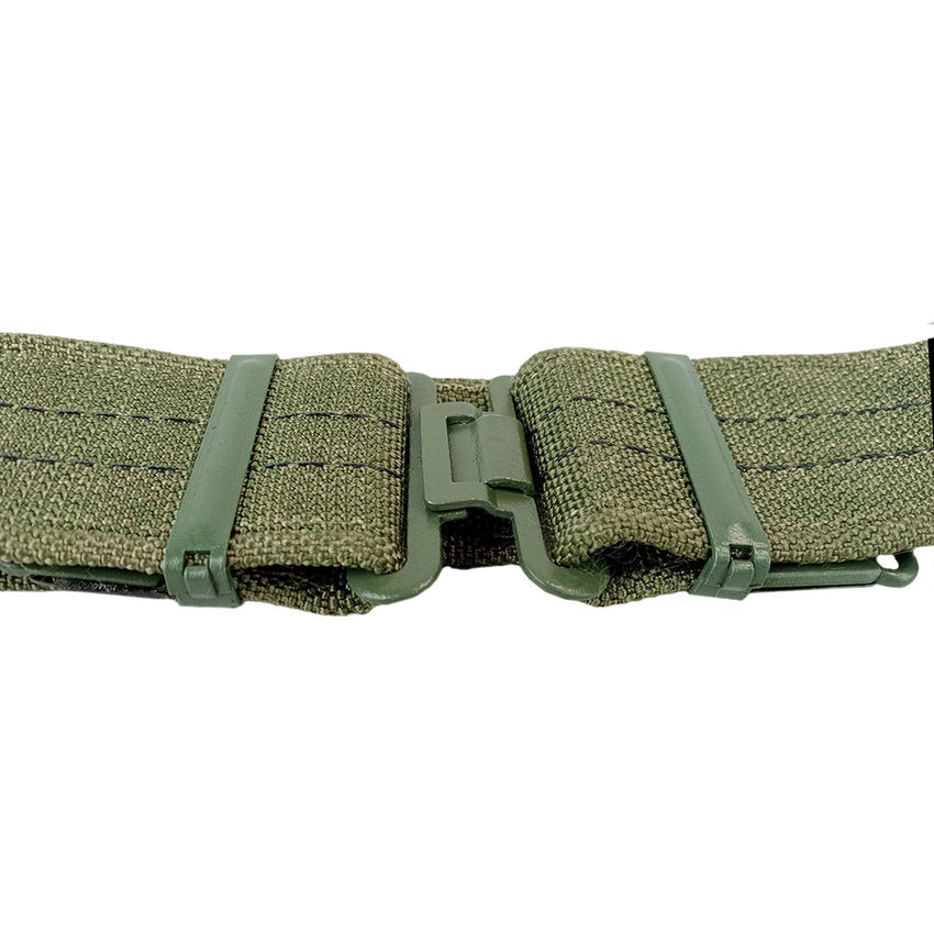 This hardy belt is olive drab, woven nylon with metal fixtures. No fancy business. Not even any different sizes, just one length (fits up to 42'', about medium size) + buckle and ability to adjust smaller. The buckle is a no fuss hook-through type and the belt has metal capped ends with claws to hold your adjustment. Some storage blemishes but otherwise pretty much unused! A good belt to add to a collection and get you through ''the 4 deadly enemies of socialism. Spring, summer, autumn, winter.''