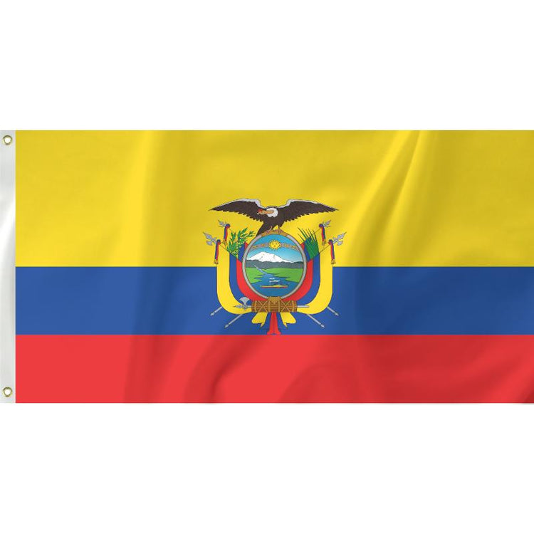 The current Ecuadorian Flag was adopted in 1835 and the coat of arms added in 1900. The image on the coat of arms contains the mountain Chimborazo, while the river below represents the Guayas. Coincidentally the ship pictured is also named Guayas, and was the first seaworthy ship built in the South Americas. Atop of the coat of arms is a condor, suggestive of the nations power.
