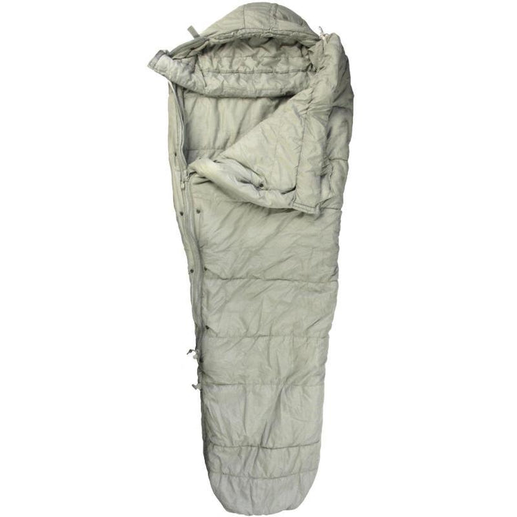 The ECWS (Extreme Cold Weather System) is a modular sleep system from the U.S. Military. These have imperfections such as small holes, fabric pilling, stains or broken zips. The system is made up of 3 items - the intermediate sleeping bag, patrol bag, and bivy bag. When all 3 bags are used together they are rated for use at -40 degrees Celsius. This is just the Intermediate sleeping bag which can be used on its own, rated at -23 degrees Celsius. It is worth noting that these ratings are based on what temperature you could survive in for a certain amount of time (4 hours), not what temperature would be comfortable.