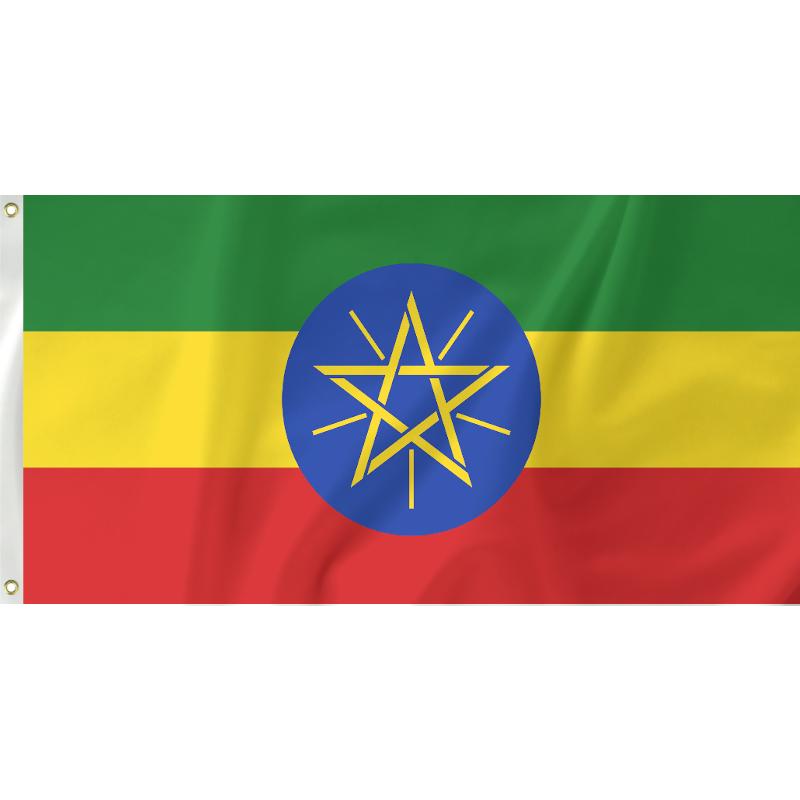 Ethiopia adopted their current flag in 1996. The flag sports Pan-African colours. The green represents the fertility of the lands and hope. Yellow represents freedom and peace. Red represents the sacrifice of Ethiopians in defense of their country.