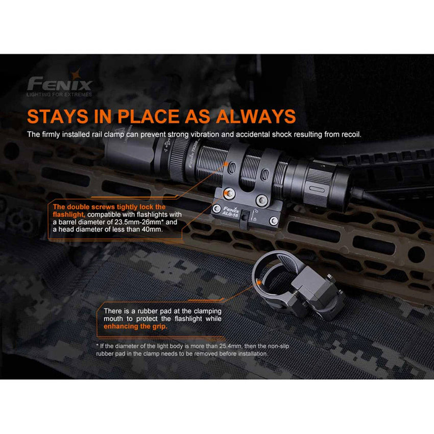 The Fenix ALG-16 M-Lok Rail Mount, is a great solution for mounting a flashlight to a rifle with a M-Lok guide rail. The quick release roller allows you to mount a flashlight for a secure fit. Made of hard-anodized aluminum, the Fenix ALG-16 M-LOK Rail Mount is strong and lightweight—perfect for harsh conditions where durability counts.