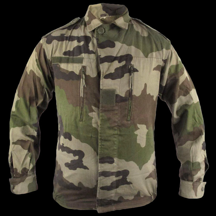 These F2 jackets have served the French Army well, and now they have surrendered them to you! The CCE (Camouflage Central Europe) is still used by French soldiers today. It's similar to the U.S. M81 woodland pattern in colouration but retains thicker horizontal stripes. The colours can vary with manufacture and age, as shown in the picture.