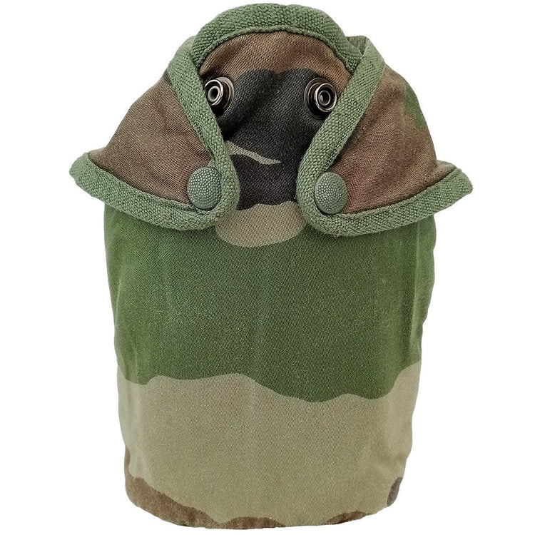 Love CE camouflage, building a French kit or just want something to hold your canteen? Pick up a French Centre Europe camouflage 1L canteen cover. They have four snap domes to the front to fit your canteen and to the back is a M1910 style wire hook and webbing to pass a belt through. The insulated interiors are various kinds of felted material (likely wool, see image) and will help keep your flask cool.