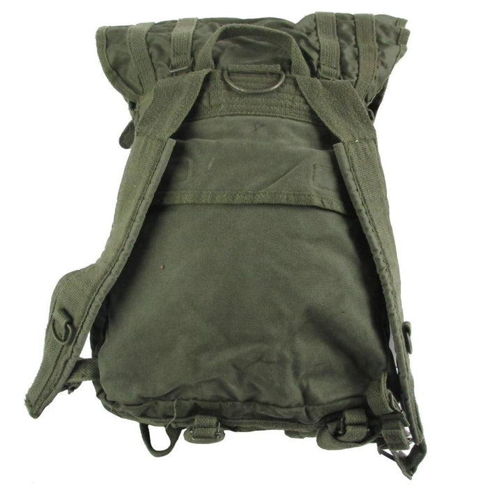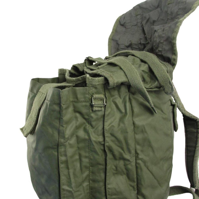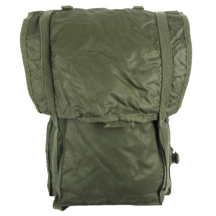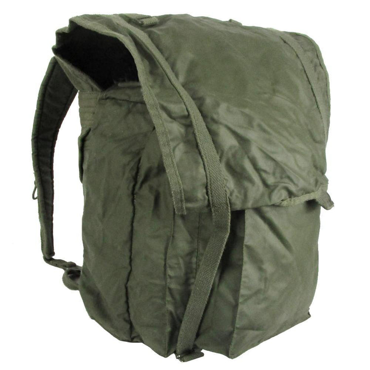 The F1 pack was issued to French soldiers for field exercises and short trips. It's a perfect size for day trips and the rugged construction makes it useful for battling rough weather conditions. Made from a water resistant rubberised canvas material to keep the contents dry and protected - though this exterior coating is worn down on many packs. The 20 liter size is split up into three compartments covered by a top flap. On the back is a pocket and the lightly padded shoulder straps. Underneath, the pack features straps for holding a poncho or tarp. The French Army have already tested these packs on the field, now they're here for you to take on your adventures! Ideal for day trips, travel or expand your French military collection.