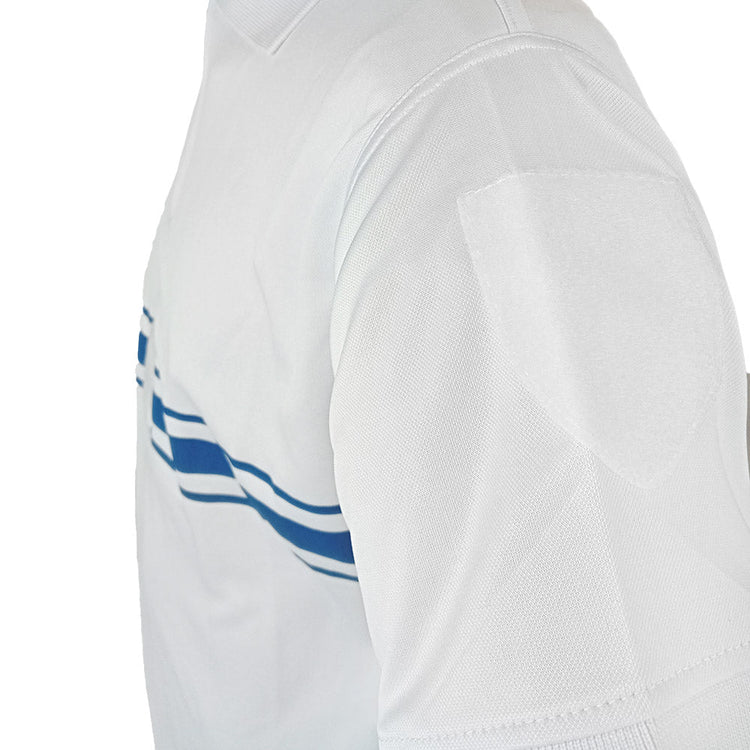This shirt has little stretch compared to our other French Municipal form fitted wares - more of a regular fit. The fabric has a slight sheen and conforms well to the body. There is a small zip in the front, allowing the collar to fit snug or let some fresh air in. Patches (or racing numbers ???) may be attached via the hook & loop surfaces at the front sternum and left side of the upper arm.
