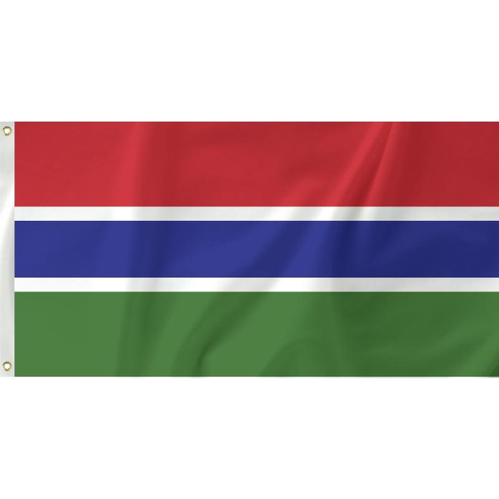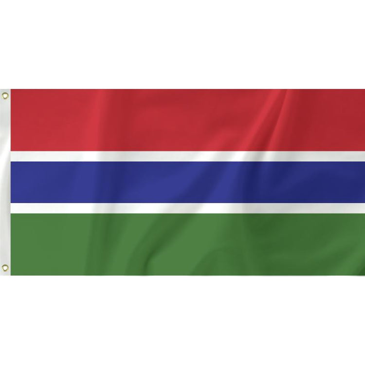 Gambia adopted their current flag in 1965 not long after gaining their independence from the British Empire. The red colour evokes the sun as well as the savanna. The blue represents the Gambia river which is the nations key feature and its namesake. The green strip represents the nations dependence on agricultural goods. And finally the white strips represent unity and peace.