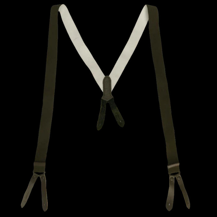 The Y-shape design is made from an elasticated material with leather button tabs. The button tabs on the back sit on the end of the suspenders - these are not adjustable. However, the shoulder straps have tabs on the front for adjusting the length.