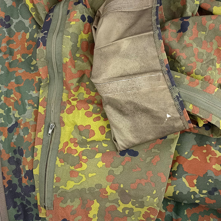 These flecktarn ''water vapour permeable 3-layer laminate'' garments have a breathable, waterproof and windproof quality, thanks to the clever construction. Being German, the permeable membrane is likely Sympatex (even better than Gore-Tex) though manufacture varies and these are dated around the 1990's.