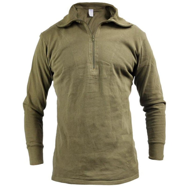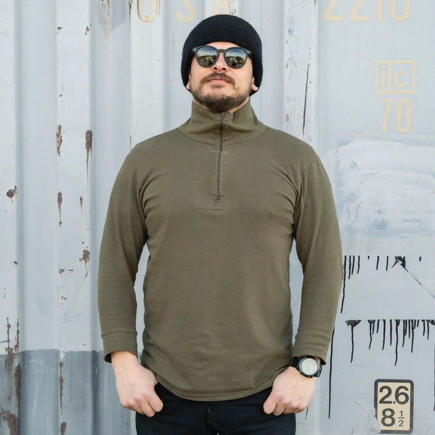 You'd be on the right path if you're getting cold weather clothing from a country that's very experienced with below freezing temps—Germany. This cotton tricot shirt is one of the base layers the Bundeswehr issue to their troops. It features a high collar for retaining heat close to the body. This collar can be zipped down for unleashing any unbridled chest hair you may want to reveal to your fellow companions. Or perhaps you just wanted to 'cool off'.