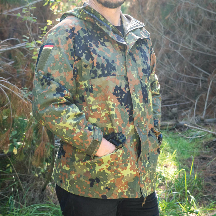 This German flecktarn jacket is a high quality, lightweight, and waterproof piece of clothing. The flecktarn pattern is a favourite among camouflage enthusiasts making this jacket an excellent outer layer for the colder times. These ''water vapour permeable 3-layer laminate'' garments have a breathable, waterproof and windproof quality, thanks to the clever construction. Being German, the permeable membrane is likely Sympatex (even better than Gore-Tex) though manufacture varies and these are dated around the 1990's.